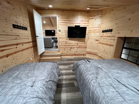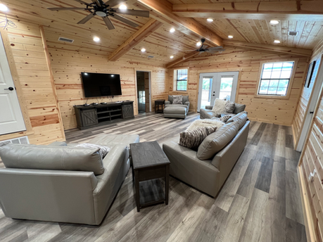 The Clubhouse lodge consists of 7 bedrooms, 3 bathrooms,16 beds and is 5250 SF. Inside you will find a magnificent hunting and sports themed lodge where every square inch is 100% tongue and groove pine. This lodge has a full kitchen, bar, two oversized family rooms and a massage room for relaxation and rejuvenation after a morning in the blind. In addition, this lodge offers an indoor/outdoor dog kennel for your canine companions so you can enjoy time in the massive 2500 SF game room, aka "the Fun Zone". The "Fun Zone" is where the party really comes to life, from ping pong, pool table, shuffleboard, darts, axe throwing, cornhole, chess and the famous "Longnecks Bar". Three 85-inch tv's to watch and cheer on your favorite sports team. Last but not least, enjoy cocktails and sunsets outside by the two relaxing firepits on the 1000 SF second floor patio or at ground level next to the main wood burning firepit, complete with plenty of Adirondacks chairs.